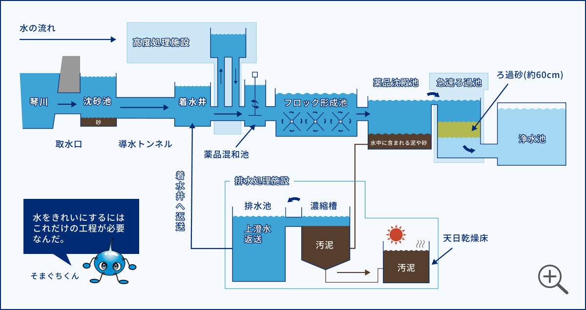 沈澱池や急速ろ過池で取り除いた泥や砂を集める施設です。