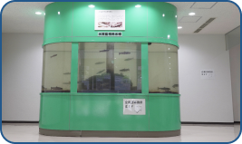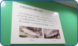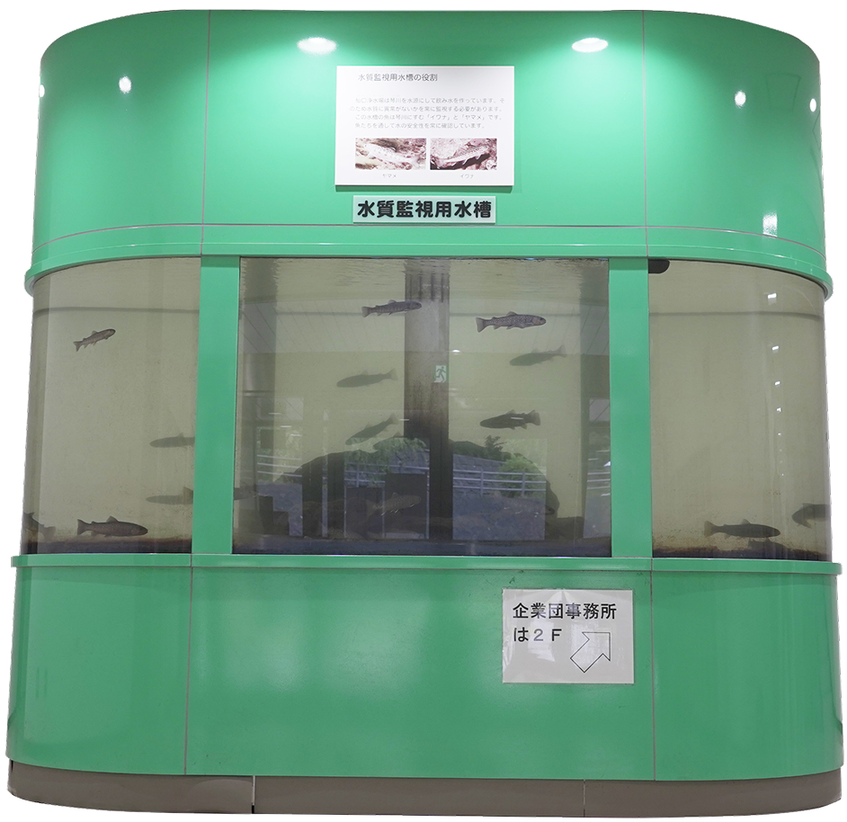 定期的な水質検査や自動水質計器で検知できない水質の異変を早期に発見するための設備で、原水を導いた水槽に、魚類(イワナ)を飼育し、魚の異常な行動から水質異常の有無を察知し、不測の水質事故等に対応することが目的となる。