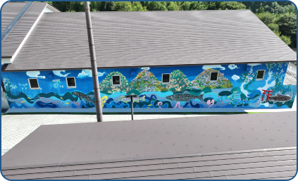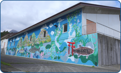 この壁画アートは、豊かな自然と清らかな水の恵みを表現し、水道事業が支える地域の暮らしの大切さを伝えるものです。今回の壁面アートは大方 岳 氏の描画手法の一つであるスプレーを中心に使用し、浄水場の外壁の一部(約160㎡)に杣口地域の風景をモチーフとした壁画を制作していただきました。