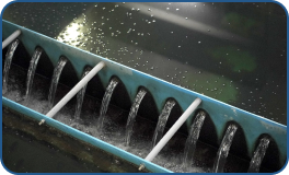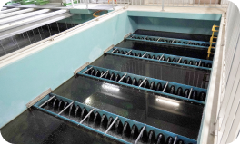 水よりも重くなったフロックを沈めて除去する。沈降速度を高め、より効果的に沈澱除去するため傾斜板を設置してある。