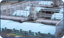 濃縮されて含水率の低下したスラッジを投入し、蒸発により自然乾燥させる。床下部には、砂ろ過の原理を応用し、ろ過層と集水管を組合せ、脱水効果をさらに高める。