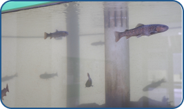 袖口浄水場は琴川を水源にして飲み水を作っています。そのため水質に異常がないかを常に監視する必要があります。この水槽の魚は琴川にすむ「イワナ」と「ヤマメ」です。 魚たちを通して水の安全性を常に確認しています。